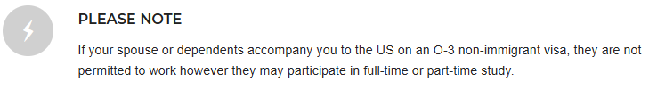 By getting approved for an O-1 visa, your spouse and unmarried children under 21 years old are eligible to accompany you to the US. Your spouse and unmarried children would obtain O3 status with your dependents. Your dependents are not permitted to work in the US with O3 status, but they can attend US schools to gain an education.